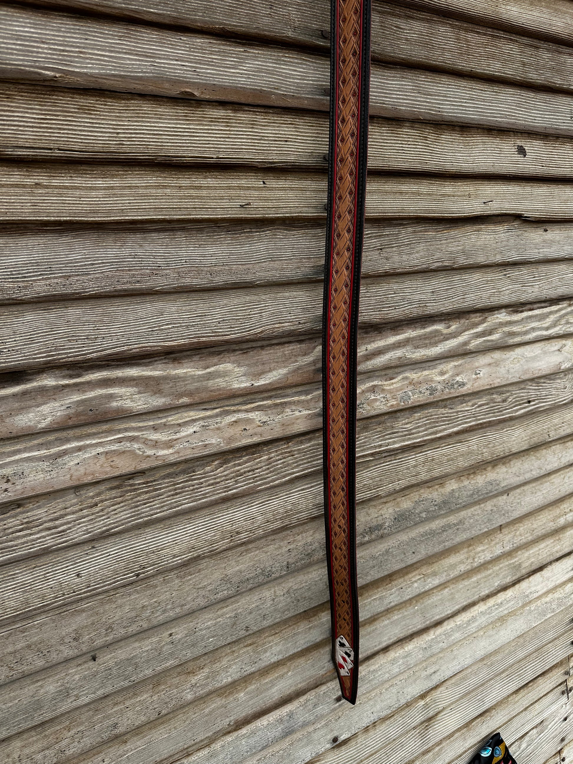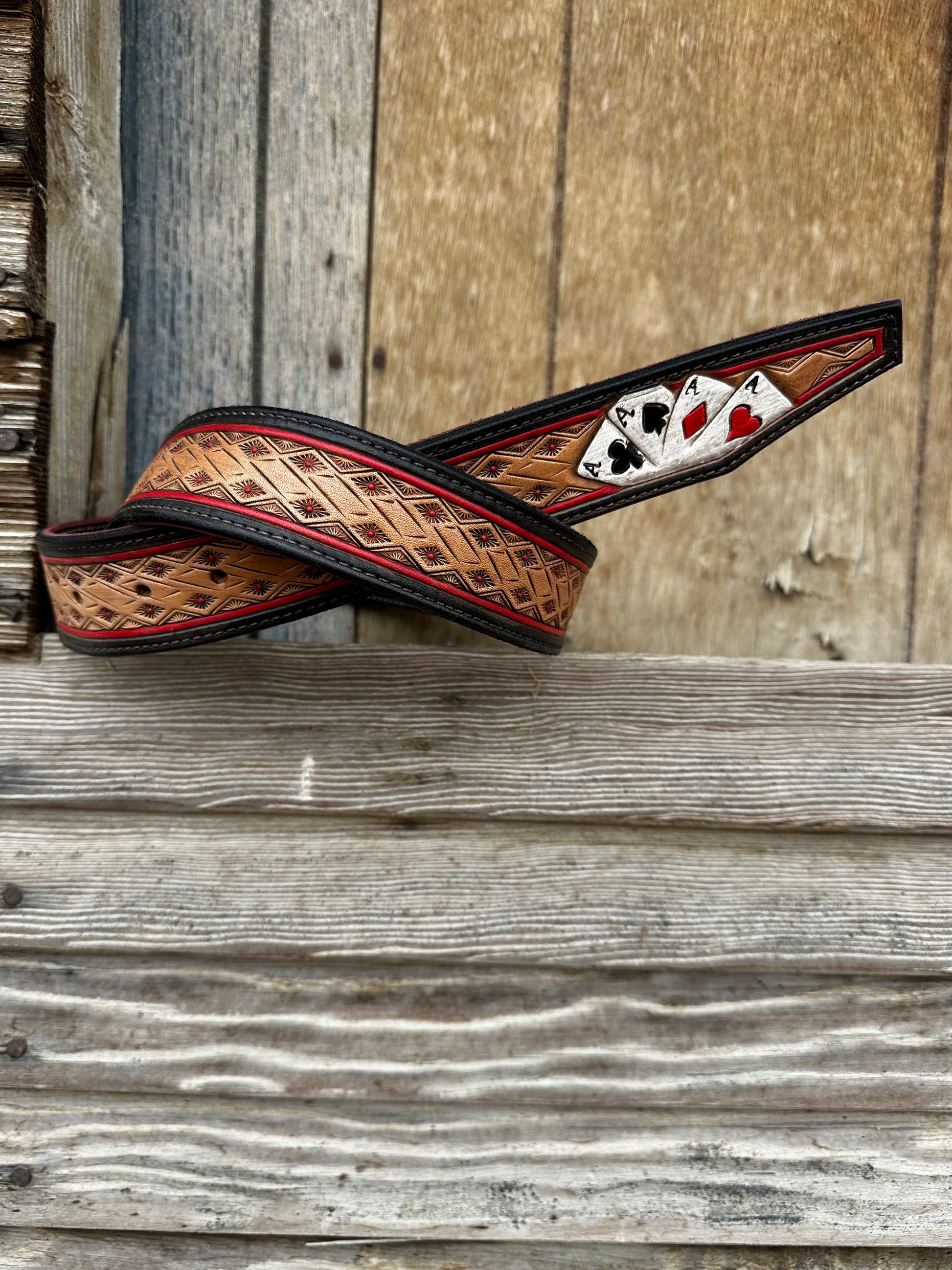 Belt with card suites on tip. Red line around outside edge. 31 1/2”-37”. Fit fold to center hole 34”.