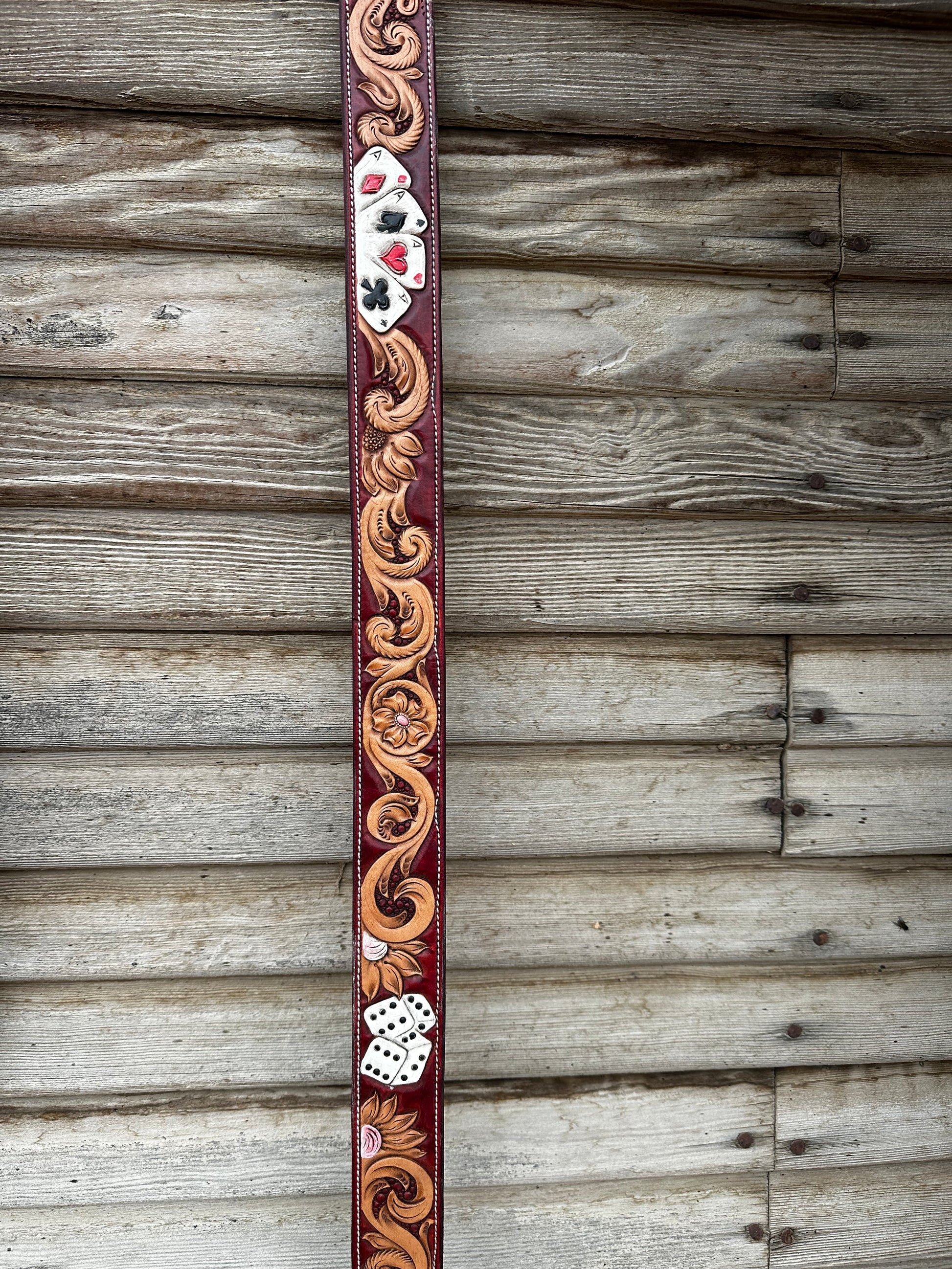 Beautiful Red background, card suites, and dice mixed with flower. Fold to 1st hole 29.5. Fold to last hole 34. Fits good in middle hole 32”.